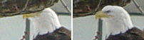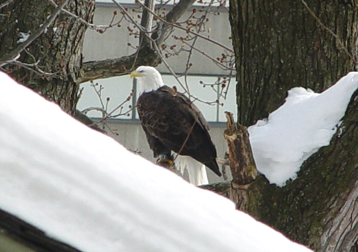 Note: This image has been edited. In the original picture the top of the eagle's head was behind and hidden by a branch. In the above image the top of the eagle's head has been restored from another photograph of the same bird.